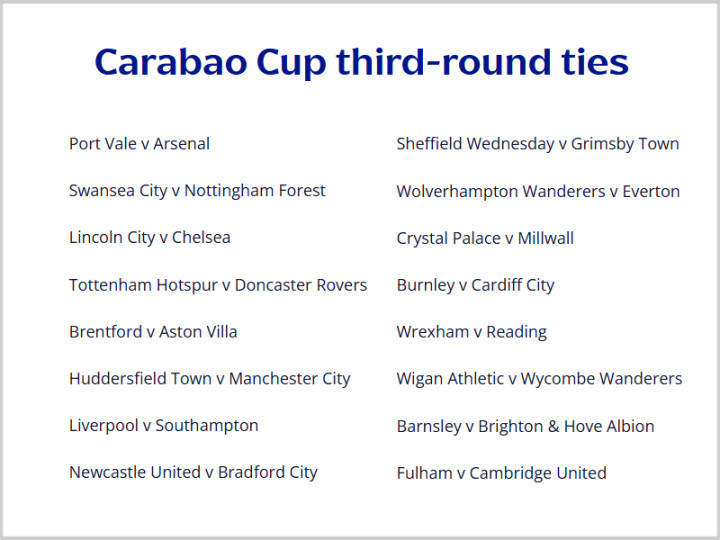 当曼联出局后,联赛杯32强随之全部确定,马上进行了抽签仪式。英超豪门的运气普遍不错,全部遇上低级别的球队,第三圈的16场比赛中,只有两场是英超球队之间的对决。