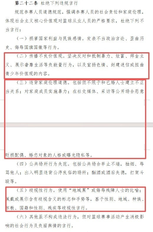 (六)其他虽不构成违法行为,但对篮球赛事活动产生消极影响的社会行为及负面舆情的言行。