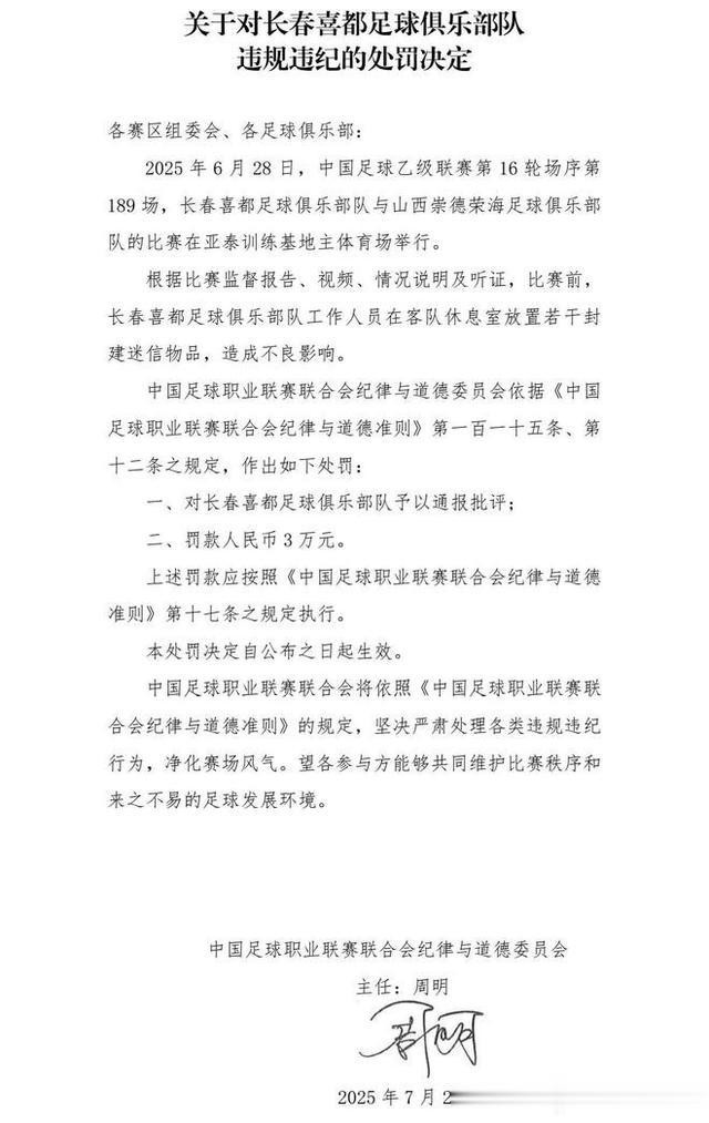 就在苑维玮下课后仅仅一天,中足联的一纸罚单将此事又推上风口浪尖。6月28日,中乙第16轮长春喜都与山西崇德荣海比赛赛后,被举报在客队的更衣室放置多张符州,经核实后,中足联对长春喜都处以通报批评并罚款3万的处罚。
