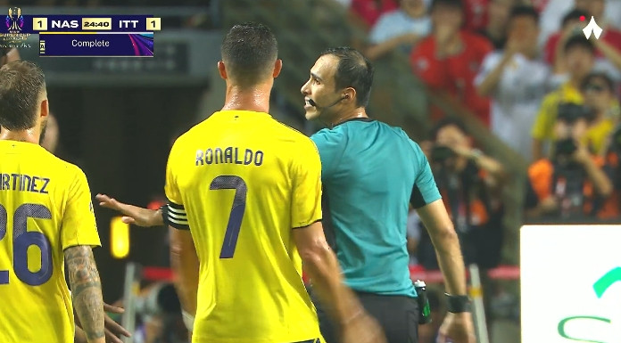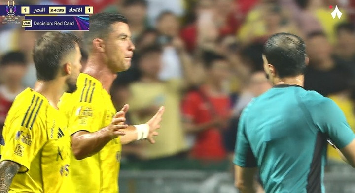 马内被直红罚下, 队长C罗对判罚感到非常不满!