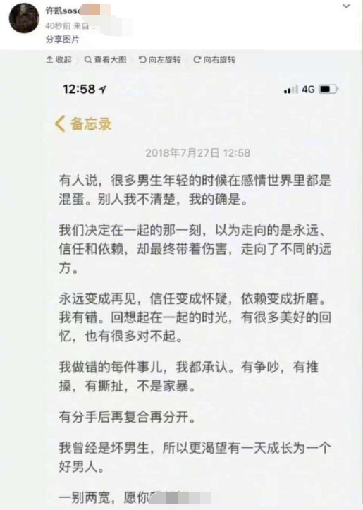 许凯方曾发文回应,两人确实恋爱过,但期间一直分分合合,“我做错的每件事儿,我都承认,有争吵,有推搡,有撕扯,不是家暴。”