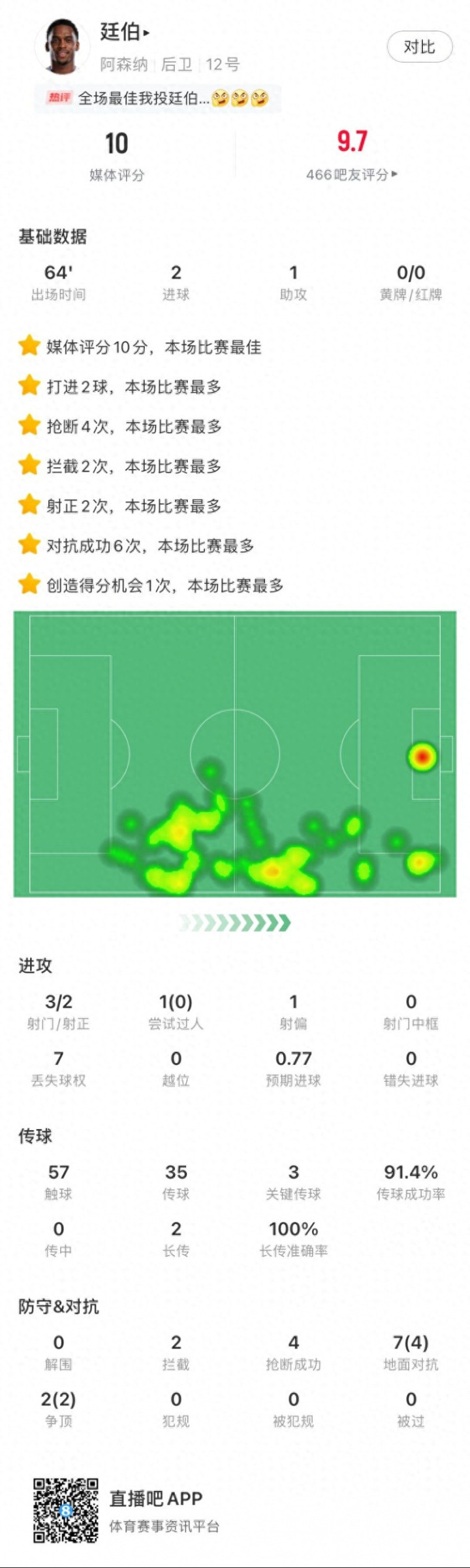 直播吧8月24日讯 英超联赛第二轮,阿森纳主场5-0大胜利兹联。本场比赛,阿森纳球员廷伯表现出色,上演两射一传。以下为他在本场数据: