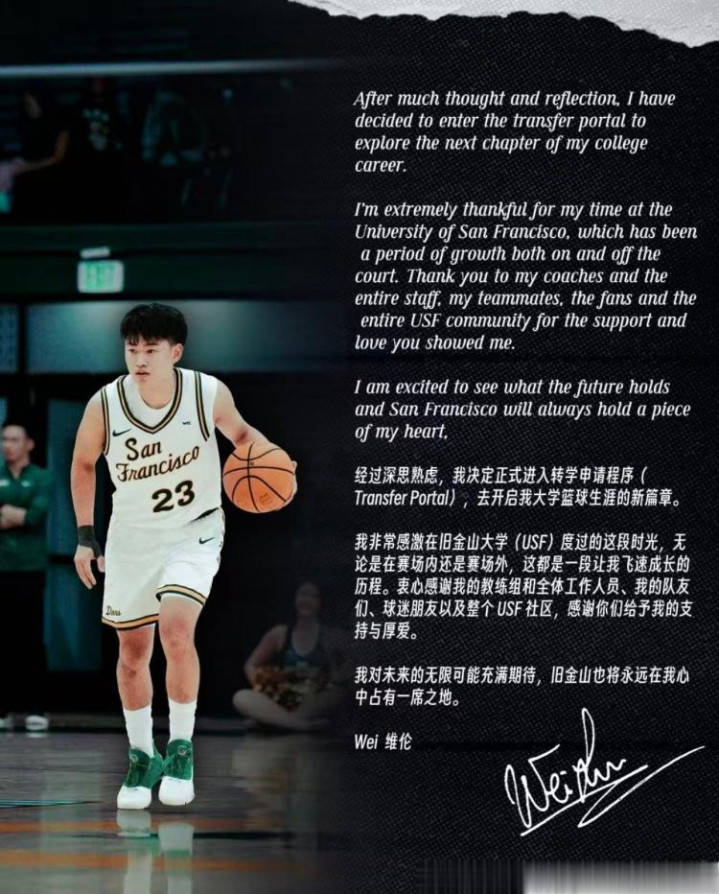 赵维伦发文写道:“经过深思熟虑,我决定正式进入转学申请程序(TransferPortal),去开启我大学篮球生涯的新篇章。我非常感激在旧金山大学(USF)度过的这段时光,无论是在赛场内还是赛场外,这都是一段让我飞速成长的历程,衷心感谢我的教练组和全体工作人员、我的队友们、球迷朋友以及整个USF社区,感谢你们给予我的支持和厚爱。