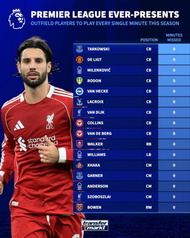 本赛季英超全勤非门将球员: